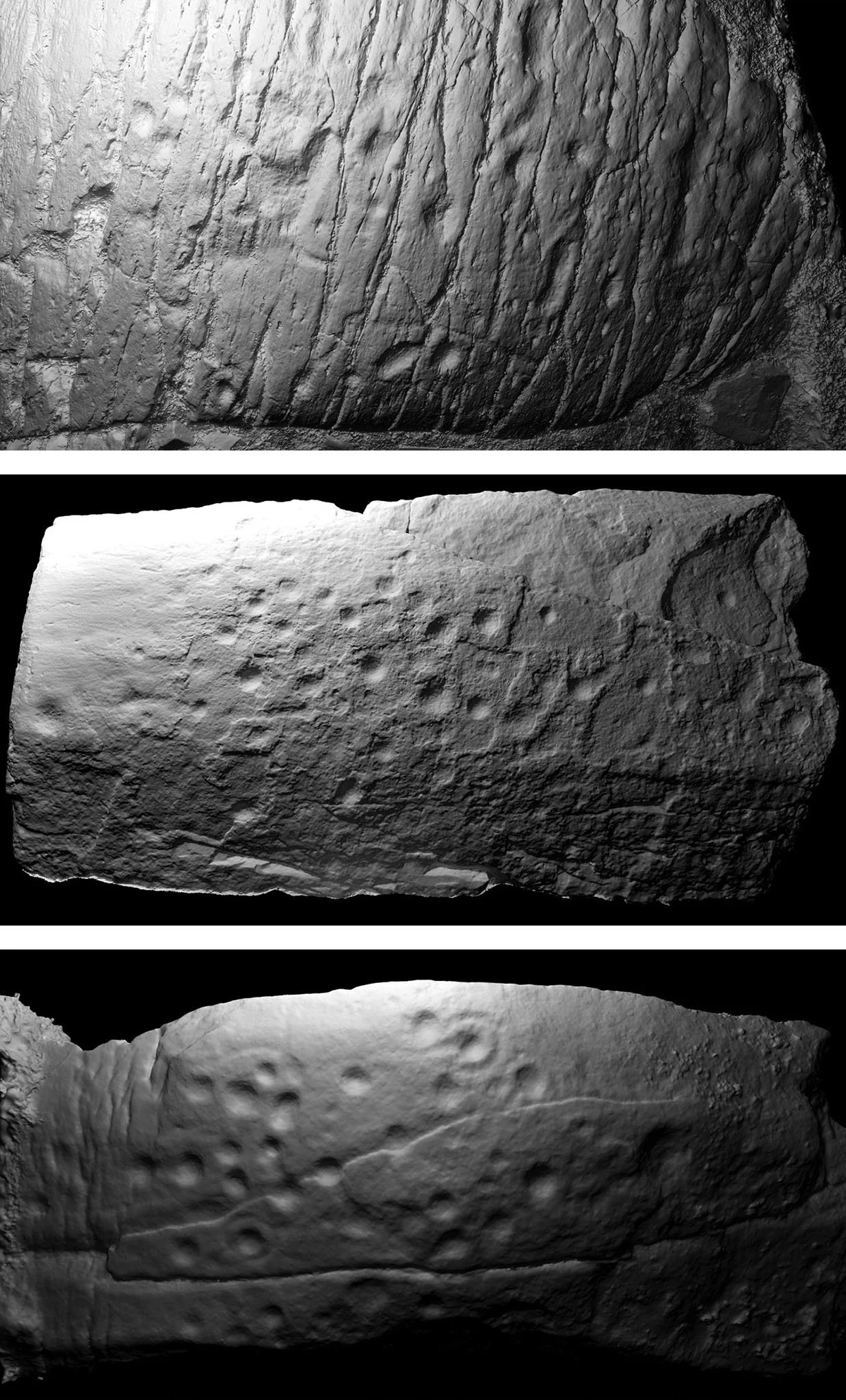 Above: Comparison between Site 2 (upper), Nether Largie North cist slab (middle) and Nether Largie standing stone (lower).