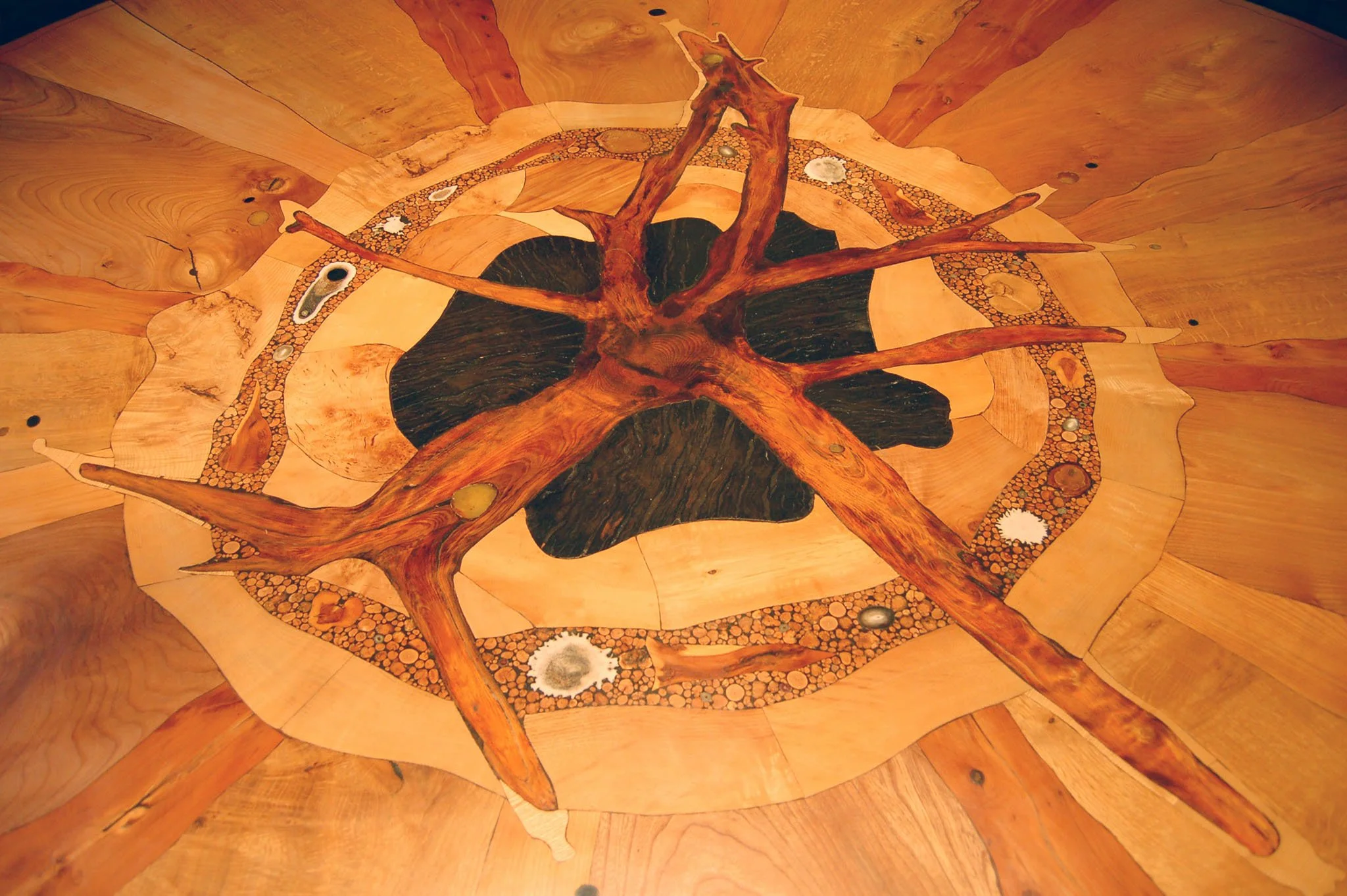 The table itself is constructed from a variety of types of wood with natural materials such as bird quills, antler, horn, jet and amber inset.